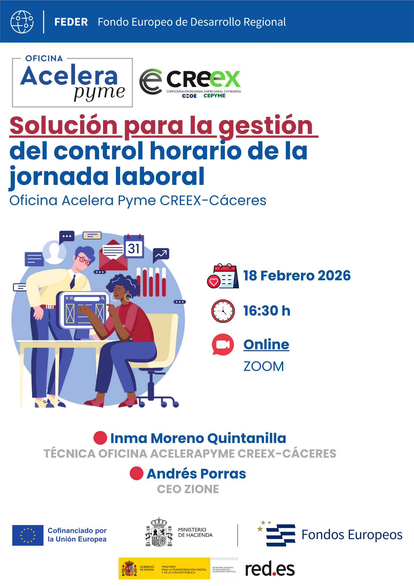 Con el objetivo de que el tejido empresarial cacereño pueda implantar una solución real, la Oficina Acelera Pyme CREEX–Cáceres organiza la jornada “Solución para la gestión del control horario de la jornada laboral”.