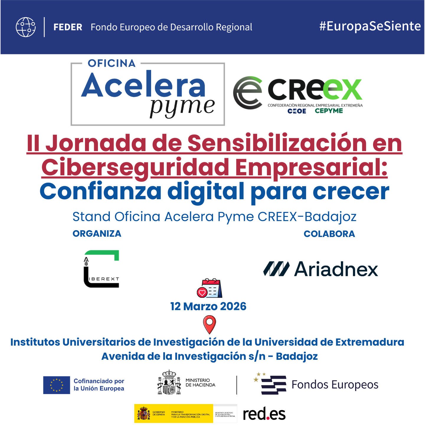 Por eso, Acelera Pyme CREEX estará presente con un stand en la “II Jornada de Sensibilización en Ciberseguridad Empresarial: Confianza digital para crecer”, un encuentro centrado en ciberseguridad para empresas, organizado por CIBEREXT y en el que colabora ARIADNEX que se celebra el 12 de marzo de 2026 en los Institutos Universitarios